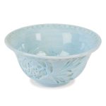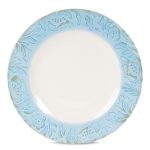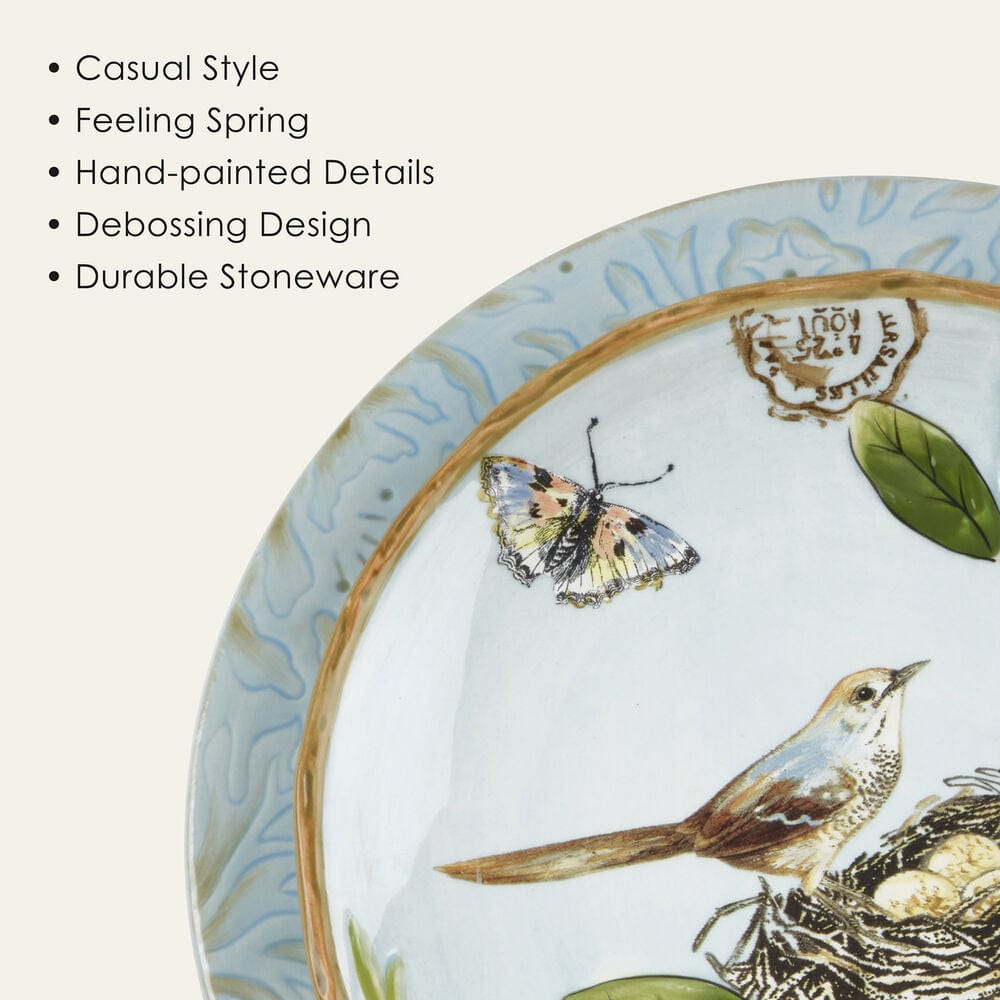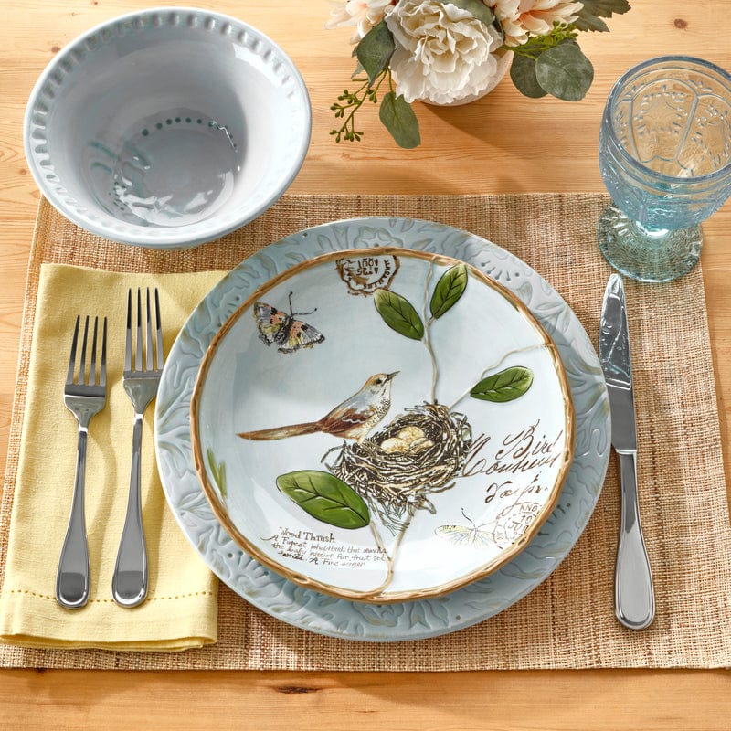 Take a look into nature’s sketchbook at the Toulouse Blue Dinnerware Set featuring soft shades of blues and taupes with a hand thrown textured look of solid color pottery with spontaneous glaze and debossing. Inspired from preserving nature’s gifts of a garden with song birds, butterflies and handwritings from old Europe with a feeling of eternal spring, this place setting will enhance any table.